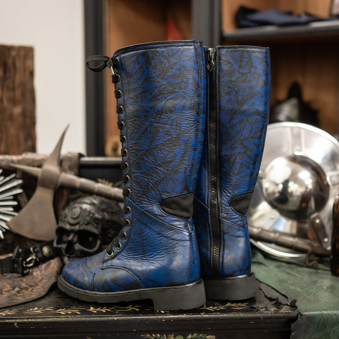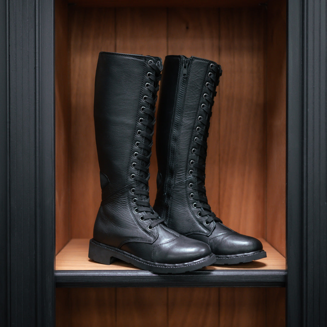 Step into legend with the Women's Ares Knee-High Boots, handcrafted from premium waxed cowhide leather and engineered for warriors of everyday adventure. These heirloom-quality boots feature Goodyear welt-stitched, replaceable soles built to endure a lifetime of quests, paired with a sport-lined interior that breathes with your stride. The innovative suede-textured Achilles panel moves fluidly with your ankle, eliminating the stiffness plaguing lesser boots. A convenient zipper closure grants swift passage, while the slightly wide comfort fit keeps feet secure without slipping. Water-resistant leather withstands muddy battlefields and forest trails alike. With double-stitched load-bearing panels and friction-grip grommets, these boots stand ready for LARP campaigns, daily wear, and beyond. Customize with alternative laces and modular accessories to suit your armor.
