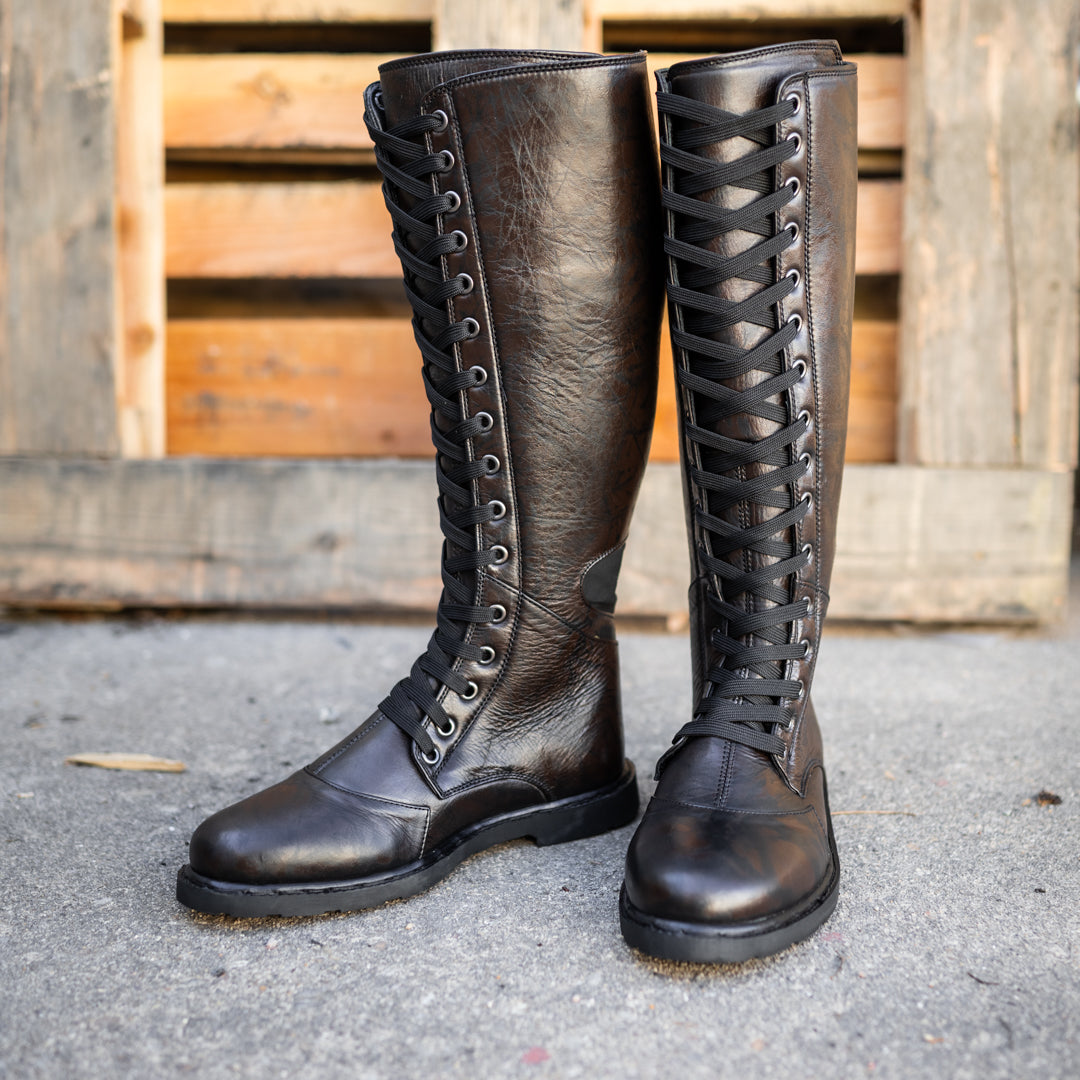 Step into the realm of adventure with Women's Orion Knee-High Boots; the ultimate choice for Renaissance Faire wanderers, LARP warriors, and fantasy enthusiasts. Hand-crafted from premium cowhide leather, these authentic lace-front boots feature a zipperless design that delivers genuine medieval aesthetics without compromise. The flexible Goodyear-welted sole conquers muddy fairgrounds and forest trails while remaining light enough for all-day wear at your favorite fantasy event. Comfort-fit insoles and suede-textured Achilles padding provide the support needed for hours of immersive roleplay and exploration. Water-resistant leather shields your feet through any weather, and the replaceable sole ensures these boots journey with you for years of quests to come. Double-stitched construction and reinforced grommets withstand the rigors of battle reenactments and outdoor adventures. Customize with our modular boot accessories to complete your legendary ensemble.