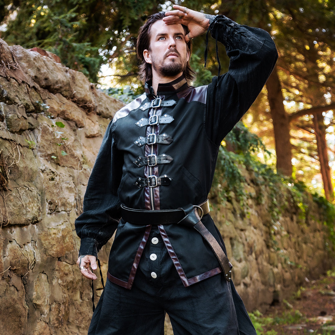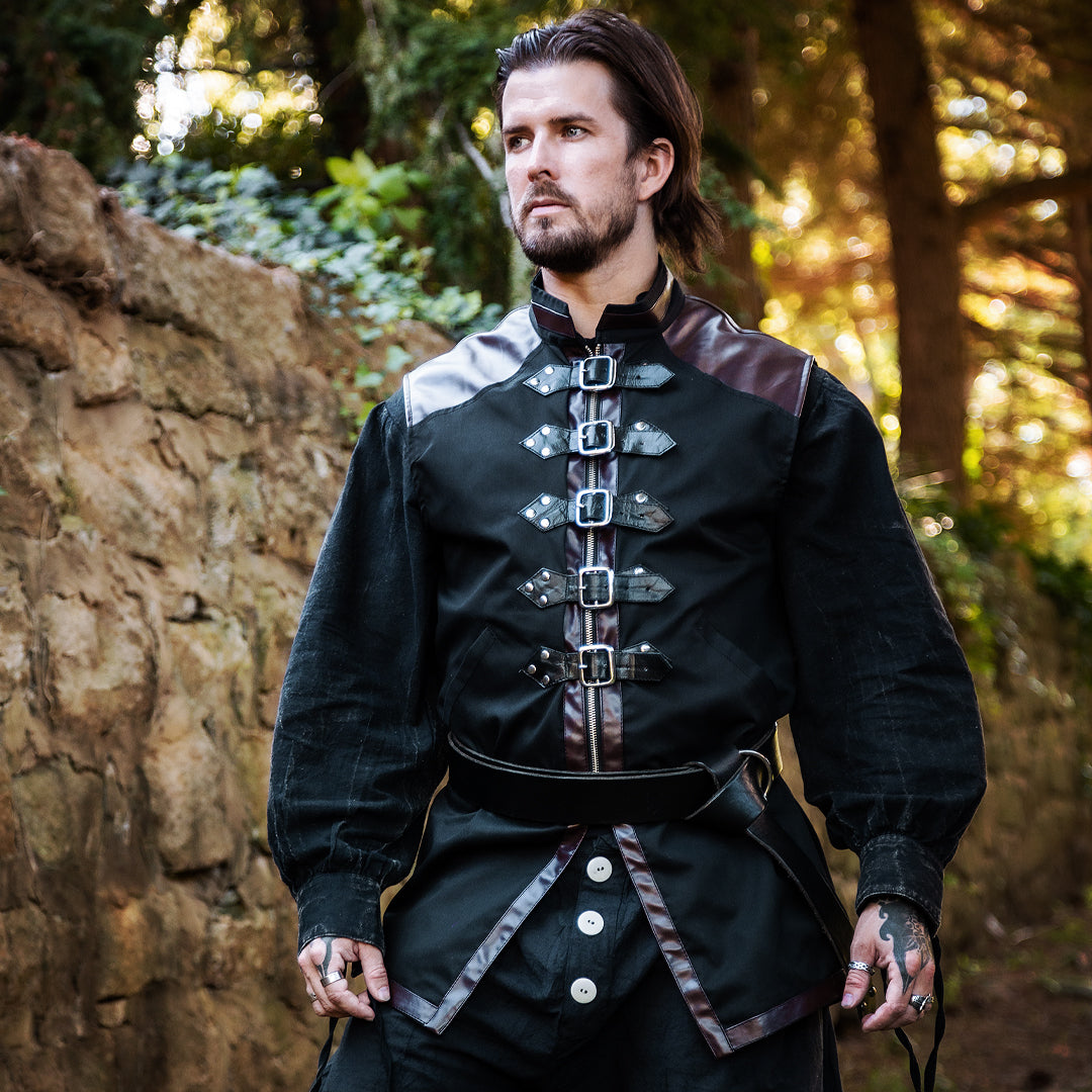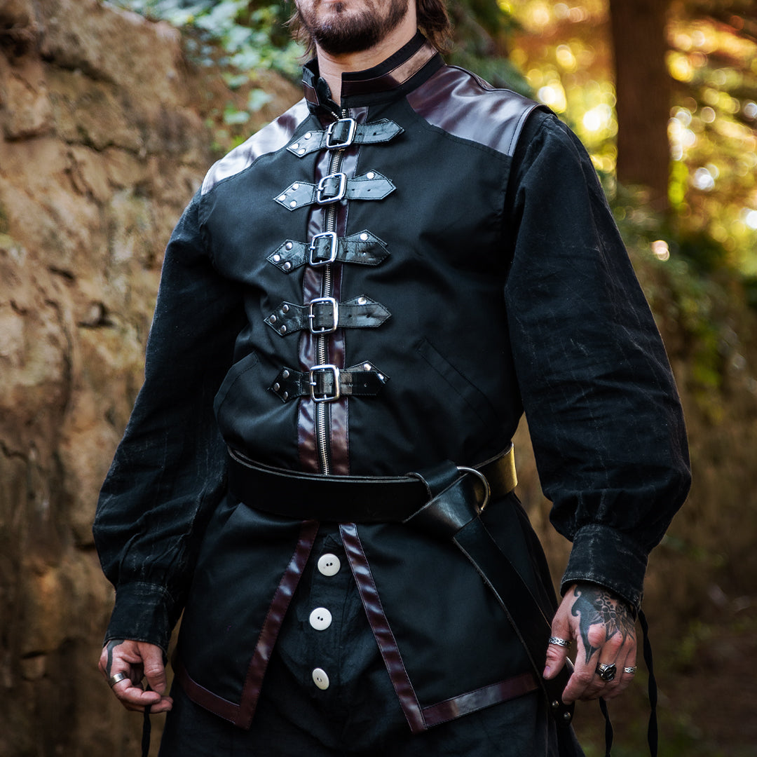 Blacktide Vest: The cunning rogue's armor of choice. Crafted from sturdy cotton canvas with rich brown faux leather accents and gleaming steel hardware, this vest commands respect at any Renaissance Faire or LARP gathering. Layer it over your finest doublet for added structure, or wear solo for unrestricted movement during combat. Functional front slash pockets keep your plunder secure. Perfect for brigands, adventurers, and swashbucklers seeking authentic medieval fantasy style with practical versatility.