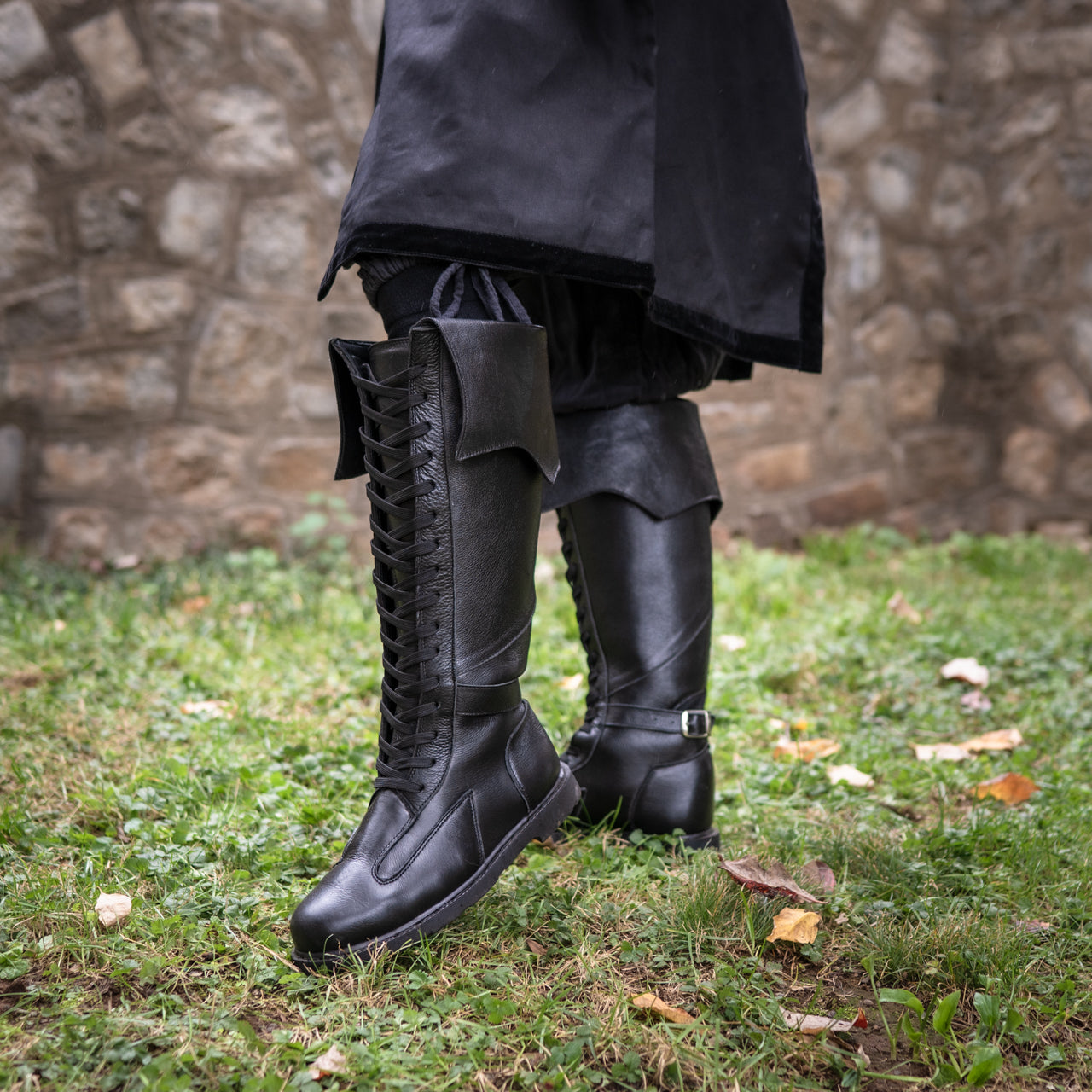 Prepare to command the seas in Women's Sea Lord Knee-High Boots, crafted from premium top-grain leather with authentic pirate fantasy flair. These limited-edition boots blend adventure-ready durability with all-day comfort, featuring a suede-textured Achilles panel that flexes with every step, double-stitched load-bearing panels, and a Goodyear-welted sole built for miles of wear. Designed for festival warriors, LARP adventurers, and costume enthusiasts who demand reliability, these boots transition seamlessly from deck to land. The water-resistant leather and hand-cut waxed details create striking contrast, while nylon-backed friction grommets and branded Verillas laces ensure lasting quality. Athletic-lined interiors and flexible soles keep feet comfortable during long wear, no heavy boot fatigue. Built to last a lifetime with proper care, the replaceable Goodyear welt sole means these boots grow with your adventures. Whether you're a pirate, buccaneer, or privateer, Sea Lord Boots deliver the envy-worthy craftsmanship that sets your costume apart. Heirloom-quality footwear tested through muddy battles and rugged terrain for over a decade.