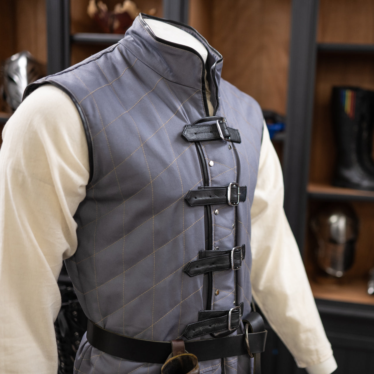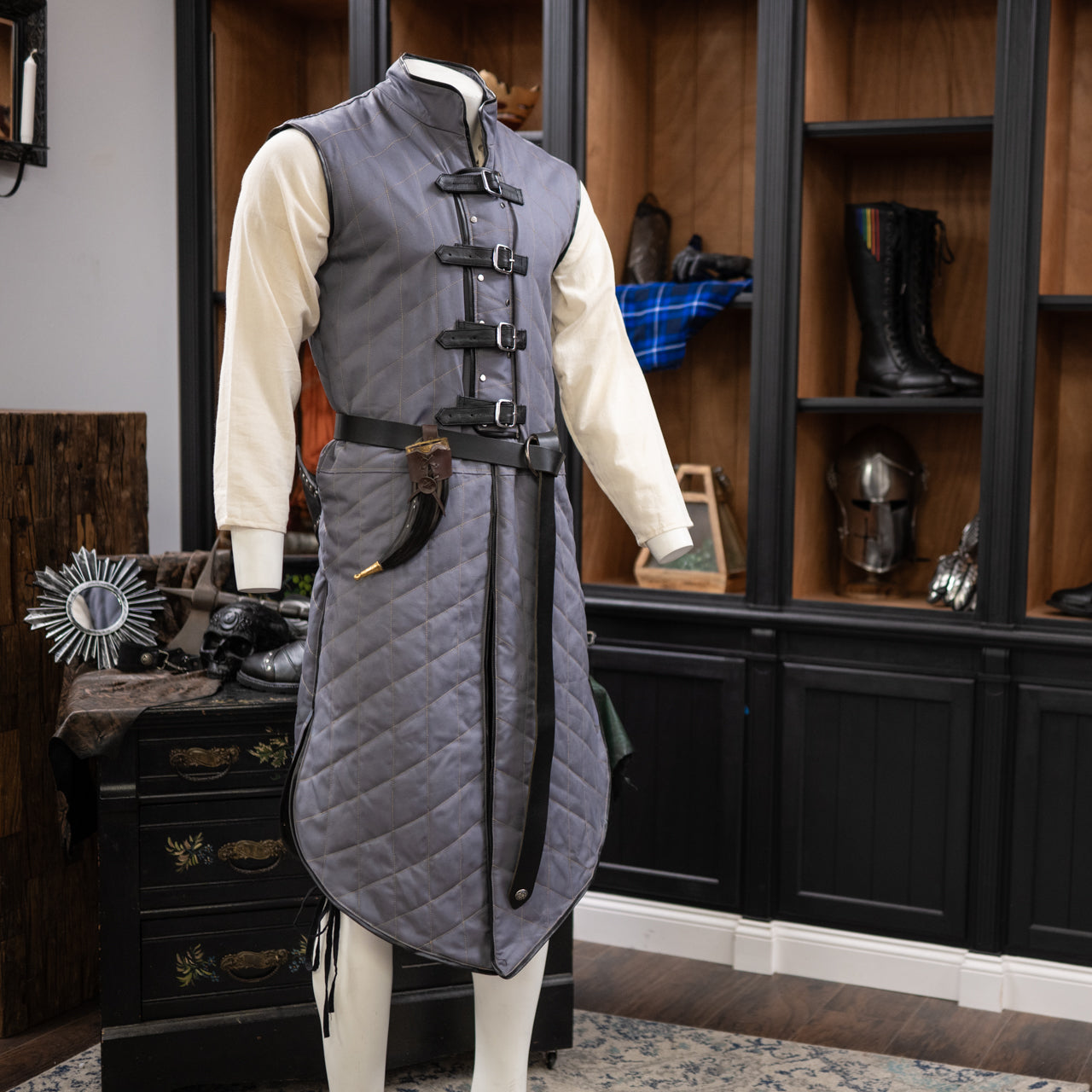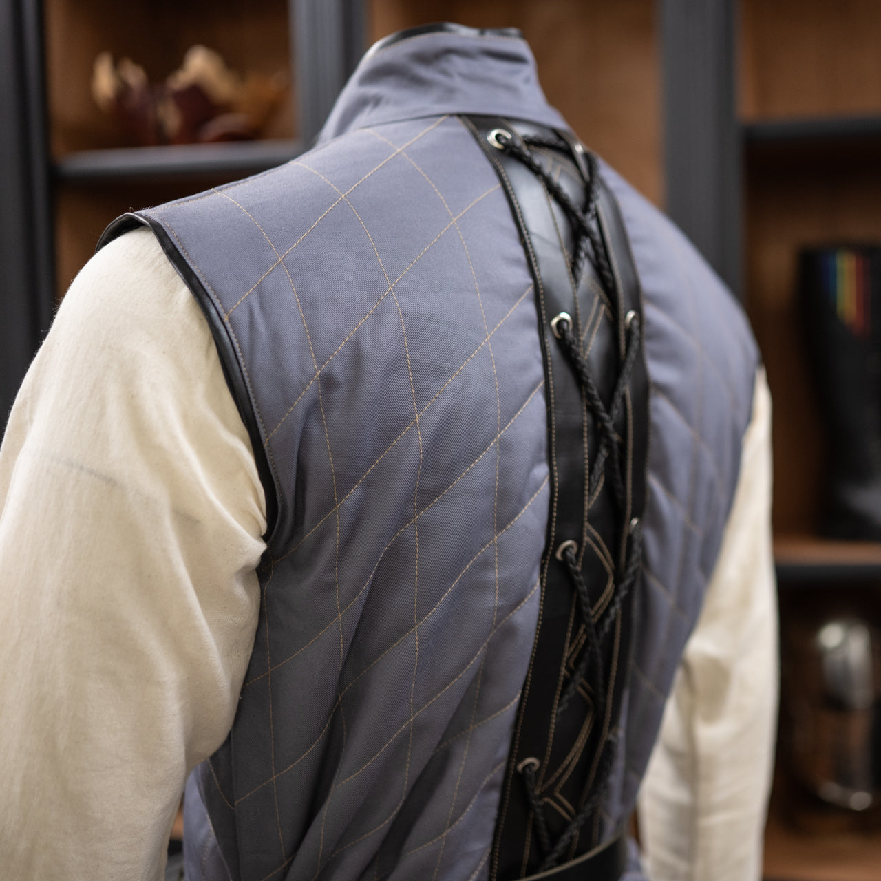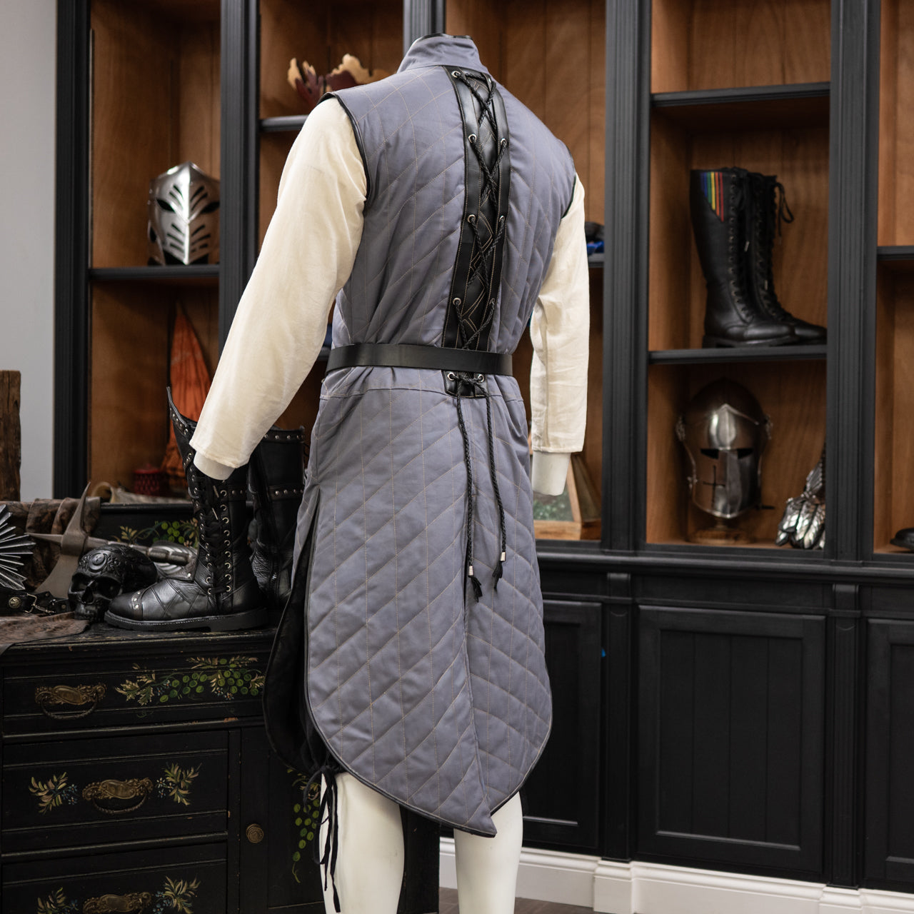 Embrace your destiny in the Bramblewood Long Vest, a handcrafted gambeson-style garment forged for warriors and adventurers alike. This sleeveless masterpiece features durable quilted poly-cotton construction reinforced with faux leather accents, buckled front closure, and a corset-style back panel for authentic medieval appeal. Layer it over tunics in winter or wear standalone during warmer seasons—pair with gauntlets, chainmail, or an overcoat to complete your legendary ensemble. Built to withstand countless quests and battles, this versatile vest transforms you into the epic hero of your own saga.