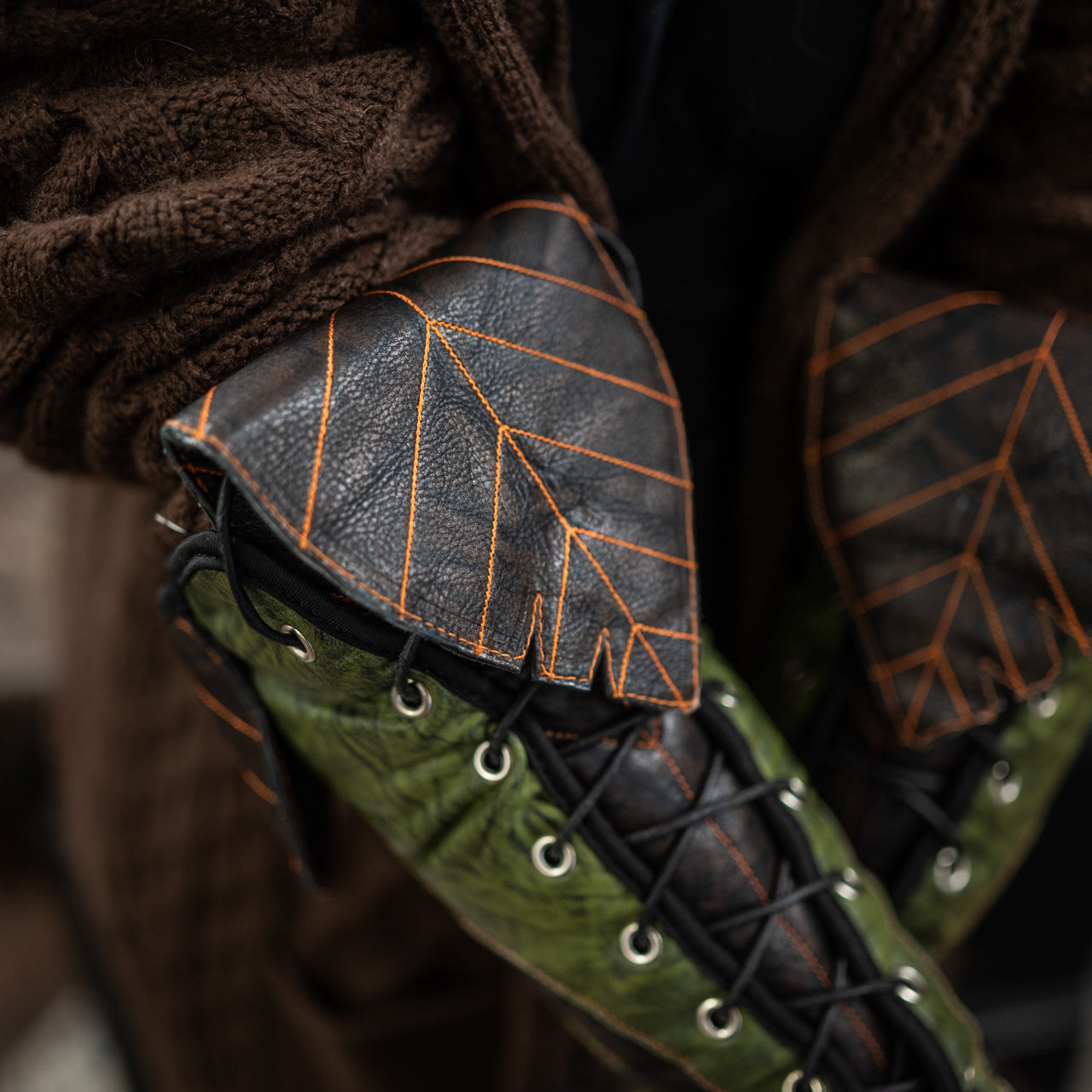 Transform your Renaissance Faire look with the Heartseeker Gauntlets, the ultimate LARP accessory crafted from premium cow leather. Featuring enchanting maple leaf cuffs that gracefully soften and drape like nature's own creation, paired with whimsical embroidery that reinforces both structure and style. The adjustable lace-up design accommodates all sizes, while hand-waxed custom coloring sets these gauntlets apart as a Verillas exclusive. Sport moisture-wicking lining keeps you comfortable during extended wear, and subtle padding provides visual richness without sacrificing mobility. Ideal for cosplay, LARP combat, and Renaissance events, these gauntlets deliver authentic fantasy aesthetics. Explore the complete Heartseeker Collection for coordinating boots and bags to perfect your ensemble.
