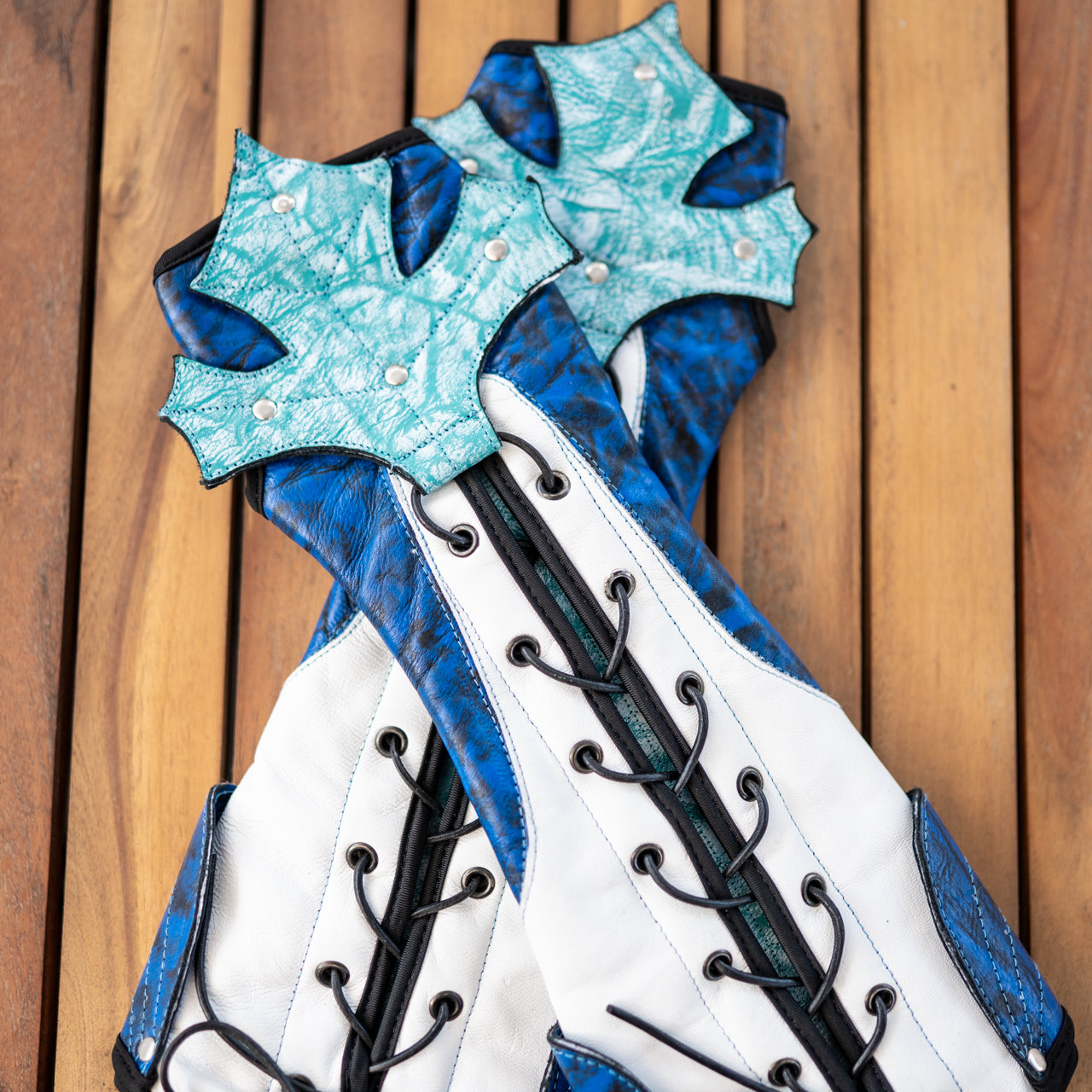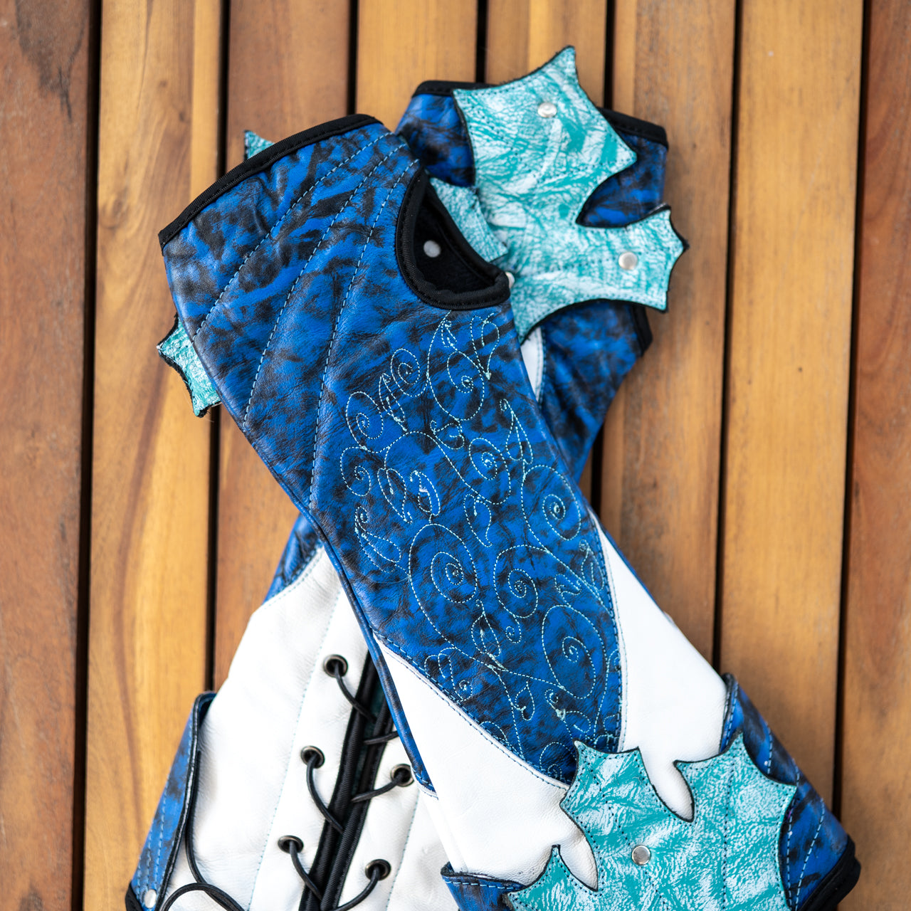 Transform your Renaissance Faire look with the Heartseeker Gauntlets, the ultimate LARP accessory crafted from premium cow leather. Featuring enchanting maple leaf cuffs that gracefully soften and drape like nature's own creation, paired with whimsical embroidery that reinforces both structure and style. The adjustable lace-up design accommodates all sizes, while hand-waxed custom coloring sets these gauntlets apart as a Verillas exclusive. Sport moisture-wicking lining keeps you comfortable during extended wear, and subtle padding provides visual richness without sacrificing mobility. Ideal for cosplay, LARP combat, and Renaissance events, these gauntlets deliver authentic fantasy aesthetics. Explore the complete Heartseeker Collection for coordinating boots and bags to perfect your ensemble.