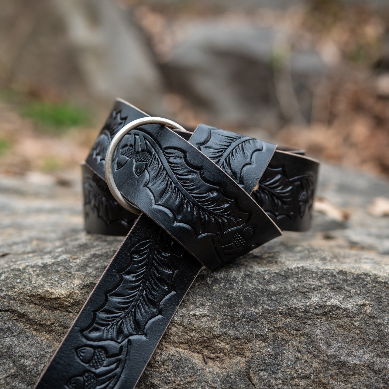 Elevate your renaissance faire outfit with the Heartseeker Leather Ring Belt, designed for adventurers and fantasy enthusiasts. This adjustable leather O-ring belt features an elegant floral pattern and offers exceptional versatility for any costume or casual wear. The ring design provides superior adjustability, accommodating most sizes with three length options: 54" (S/M), 64" (L/XL), and 74" (2X/4X). Perfect for attaching pouches, accessories, and decorative elements to complete your whimsical ensemble. Whether you're exploring faire grounds or attending festivals, this leather belt combines authentic craftsmanship with practical functionality. Part of the Heartseeker Collection for coordinated fantasy fashion.