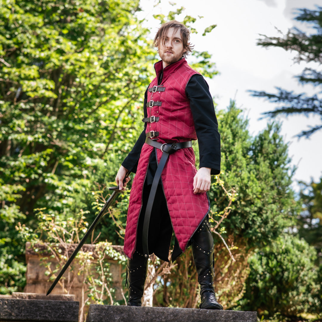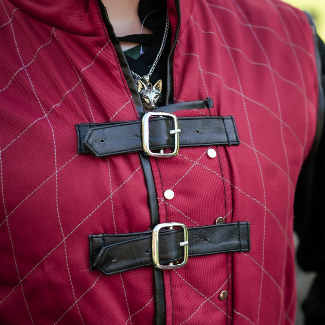 Embrace your destiny in the Bramblewood Long Vest, a handcrafted gambeson-style garment forged for warriors and adventurers alike. This sleeveless masterpiece features durable quilted poly-cotton construction reinforced with faux leather accents, buckled front closure, and a corset-style back panel for authentic medieval appeal. Layer it over tunics in winter or wear standalone during warmer seasons—pair with gauntlets, chainmail, or an overcoat to complete your legendary ensemble. Built to withstand countless quests and battles, this versatile vest transforms you into the epic hero of your own saga.