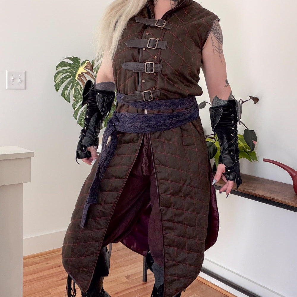 Embrace your destiny in the Bramblewood Long Vest, a handcrafted gambeson-style garment forged for warriors and adventurers alike. This sleeveless masterpiece features durable quilted poly-cotton construction reinforced with faux leather accents, buckled front closure, and a corset-style back panel for authentic medieval appeal. Layer it over tunics in winter or wear standalone during warmer seasons—pair with gauntlets, chainmail, or an overcoat to complete your legendary ensemble. Built to withstand countless quests and battles, this versatile vest transforms you into the epic hero of your own saga.