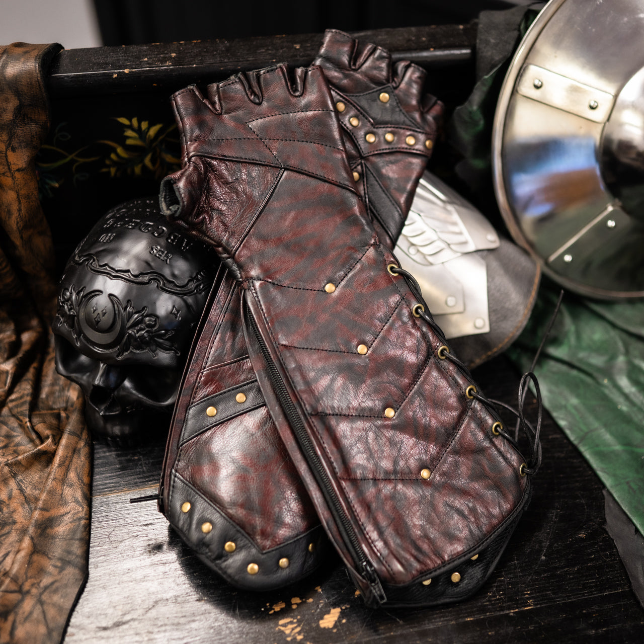 Bramblewood Gauntlets are the quintessential choice for medieval enthusiasts, Renaissance Faire adventurers, and dedicated LARP warriors. Crafted with layered leather and lined in plush fleece, these fingerless gauntlets deliver authentic fantasy aesthetics without sacrificing comfort during extended wear. The dual zip and lace closure system offers unparalleled versatility for customizing your medieval ensemble, while the fingerless design maintains full dexterity for combat, crafting, or revelry. Part of the coordinated Bramblewood Collection, these gauntlets pair seamlessly with matching boots to complete your immersive fantasy experience. Whether you're a casual faire visitor or a seasoned LARP circuit regular, these durable leather gauntlets are the timeless piece every medieval fantasy wardrobe demands.