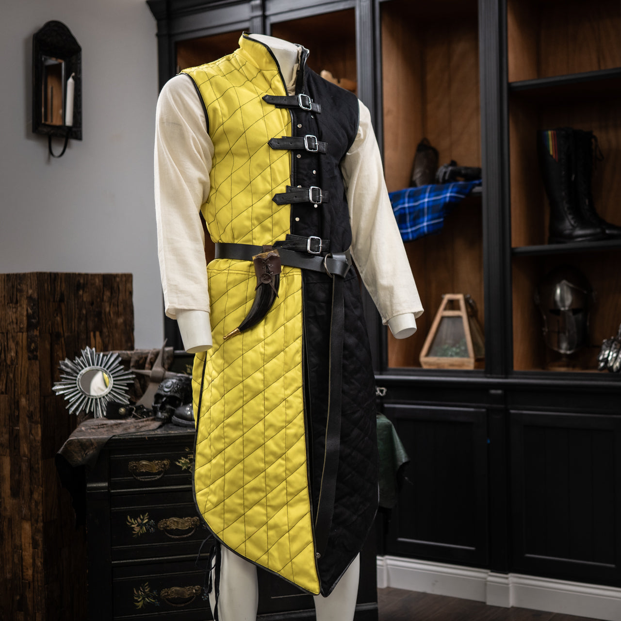 Embrace your destiny in the Bramblewood Long Vest, a handcrafted gambeson-style garment forged for warriors and adventurers alike. This sleeveless masterpiece features durable quilted poly-cotton construction reinforced with faux leather accents, buckled front closure, and a corset-style back panel for authentic medieval appeal. Layer it over tunics in winter or wear standalone during warmer seasons—pair with gauntlets, chainmail, or an overcoat to complete your legendary ensemble. Built to withstand countless quests and battles, this versatile vest transforms you into the epic hero of your own saga.