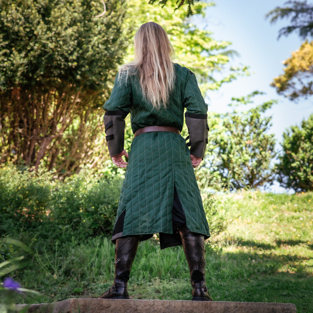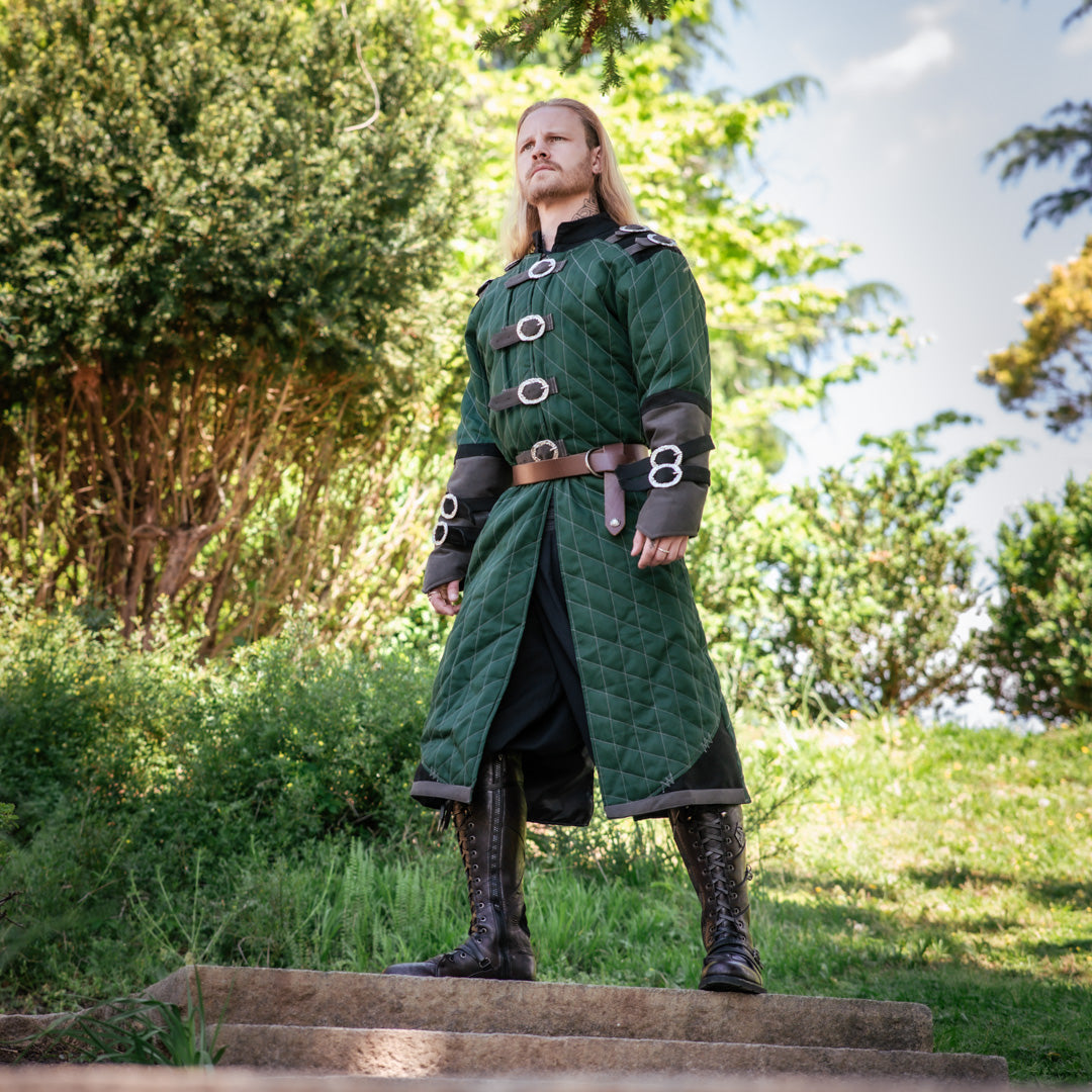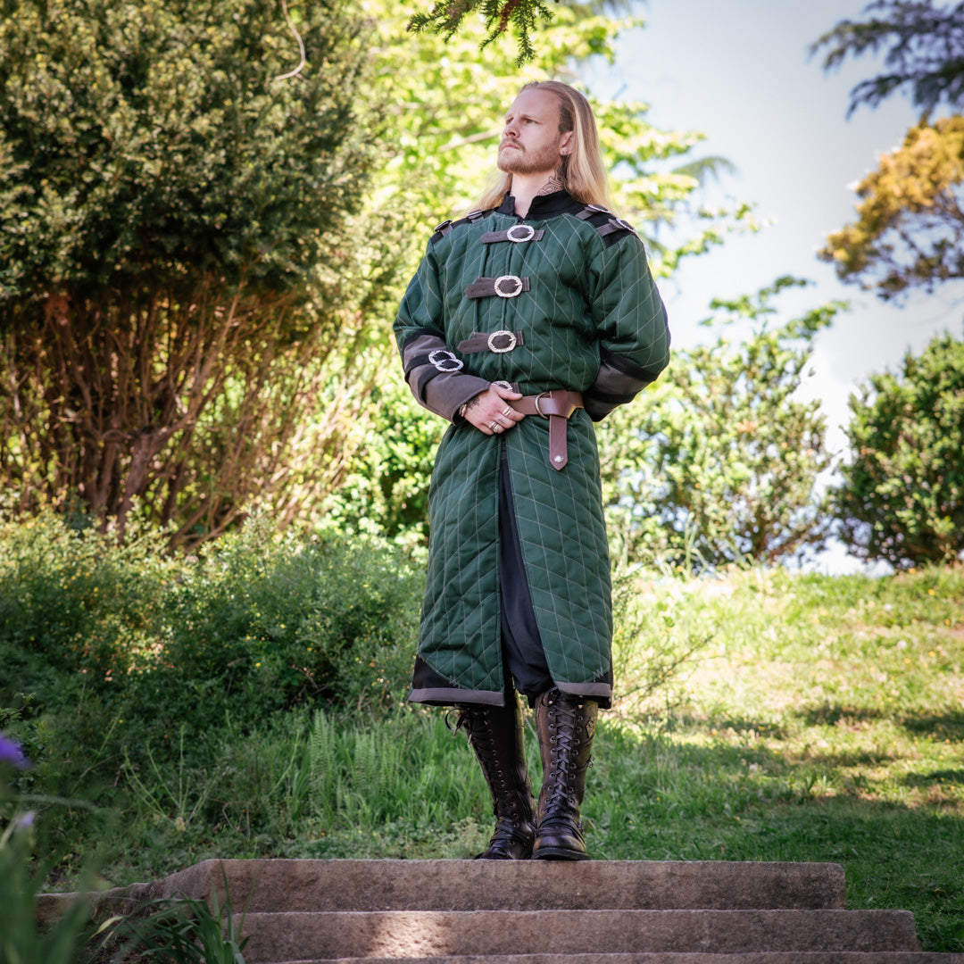 The Elderwood Gambeson stands as a masterwork of medieval craftsmanship, blending historical authenticity with fantasy artistry. This quilted warrior's garment features meticulously cast buckles and supple suede accents, each detail forged to capture the essence of legendary armor. Constructed from dual layers of premium cotton with reinforced interfacing, the gambeson is patterned generously through the chest and shoulders, granting the freedom of movement a true adventurer demands. Wear it as your outermost layer over chainmail, tunics, or padded armor for authentic layered protection. Designed to run large for versatile wear. For a fitted silhouette at the midsection, consider sizing down. Perfect for historical reenactment, fantasy costuming, LARP events, and immersive roleplay experiences.